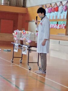 1年生の皆さんの前でお話をする院長(。-`ω-)