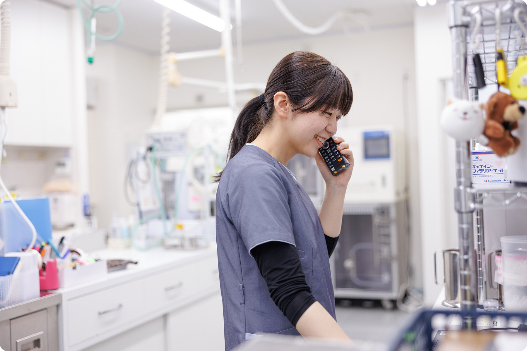 診療や手術の補助や獣医師の指示のもとで行なう処置や調剤、検査をメインに行なっています。入院動物の治療やお世話、飼い主様対応の他に、フードや備品の発注、オペの準備など裏方の業務も行います。動物たちや飼い主様が安心できるよう丁寧な対応を心がけています。