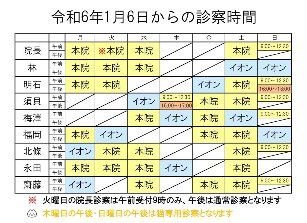 2024年1月6日(土)より獣医師の出勤曜日が変更になります。