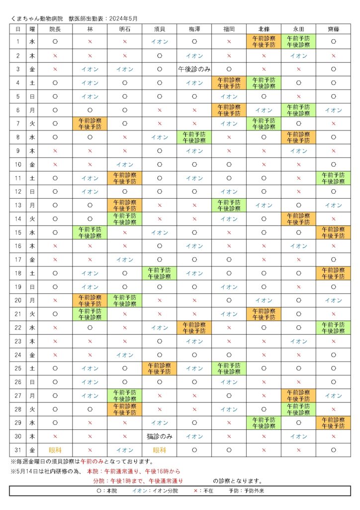 5月獣医勤務の変更についてのお知らせです。